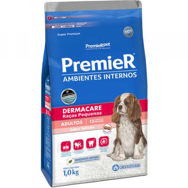 A Ração Premier Ambientes Internos Dermacare é um alimento para cães Super Premium, desenvolvido para oferecer um suporte especial para pele e a pelagem. Através da combinação de ácidos graxos essenciais (ômegas 6 e 3) e a vitamina biotina, proporciona uma pele saudável e protegida. Além disso, por ser formulado com fontes de proteína selecionadas de altíssima qualidade (salmão e ovos) e por apresentar teores elevados do mineral zinco, promove aos cães uma pelagem mais exuberante e brilhante.